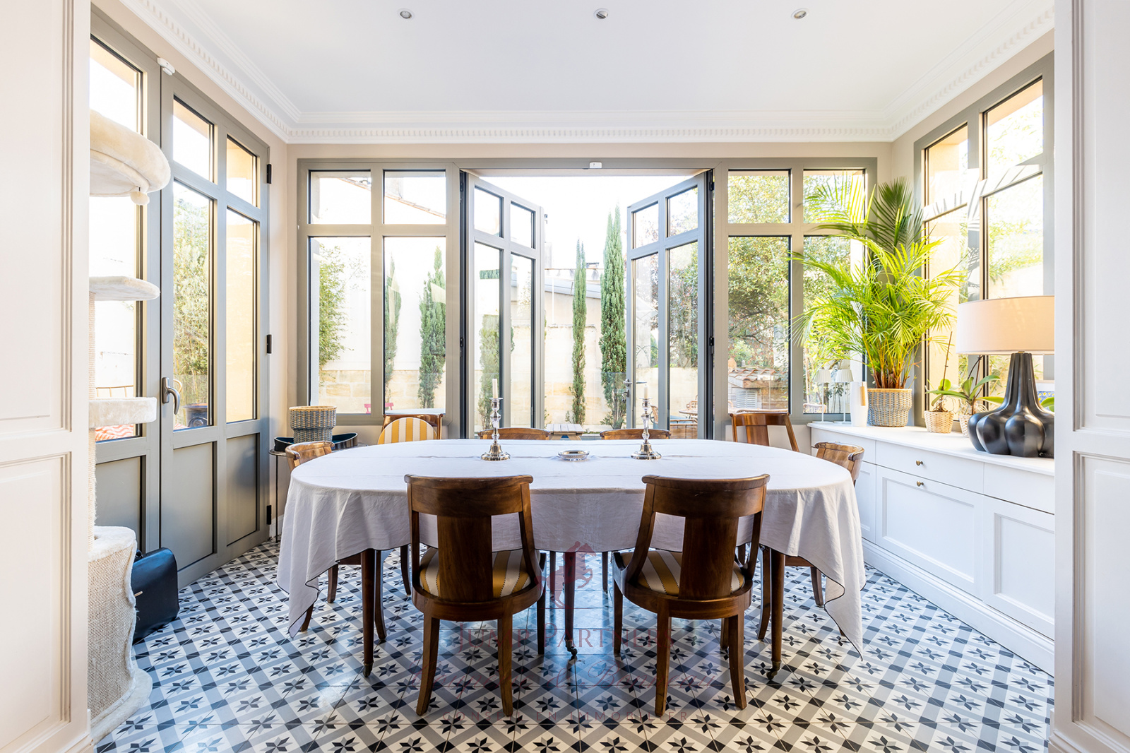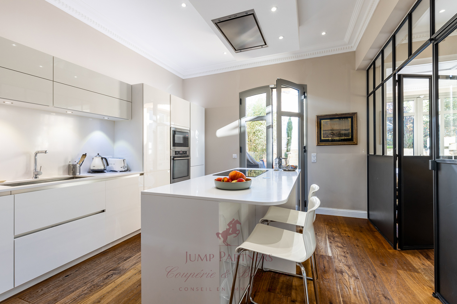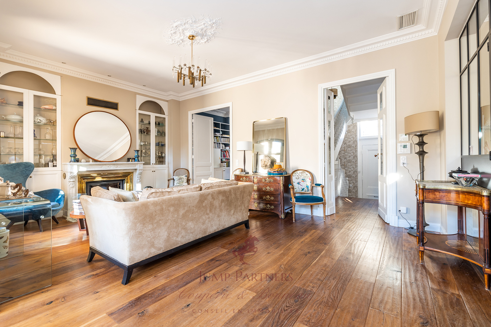 Le rez-de-chaussée dispose de très belles pièces de réception, et notamment une superbe cuisine américaine avec son ilôt central, une belle bibliothèque et une magnifique salle à manger sous véranda.