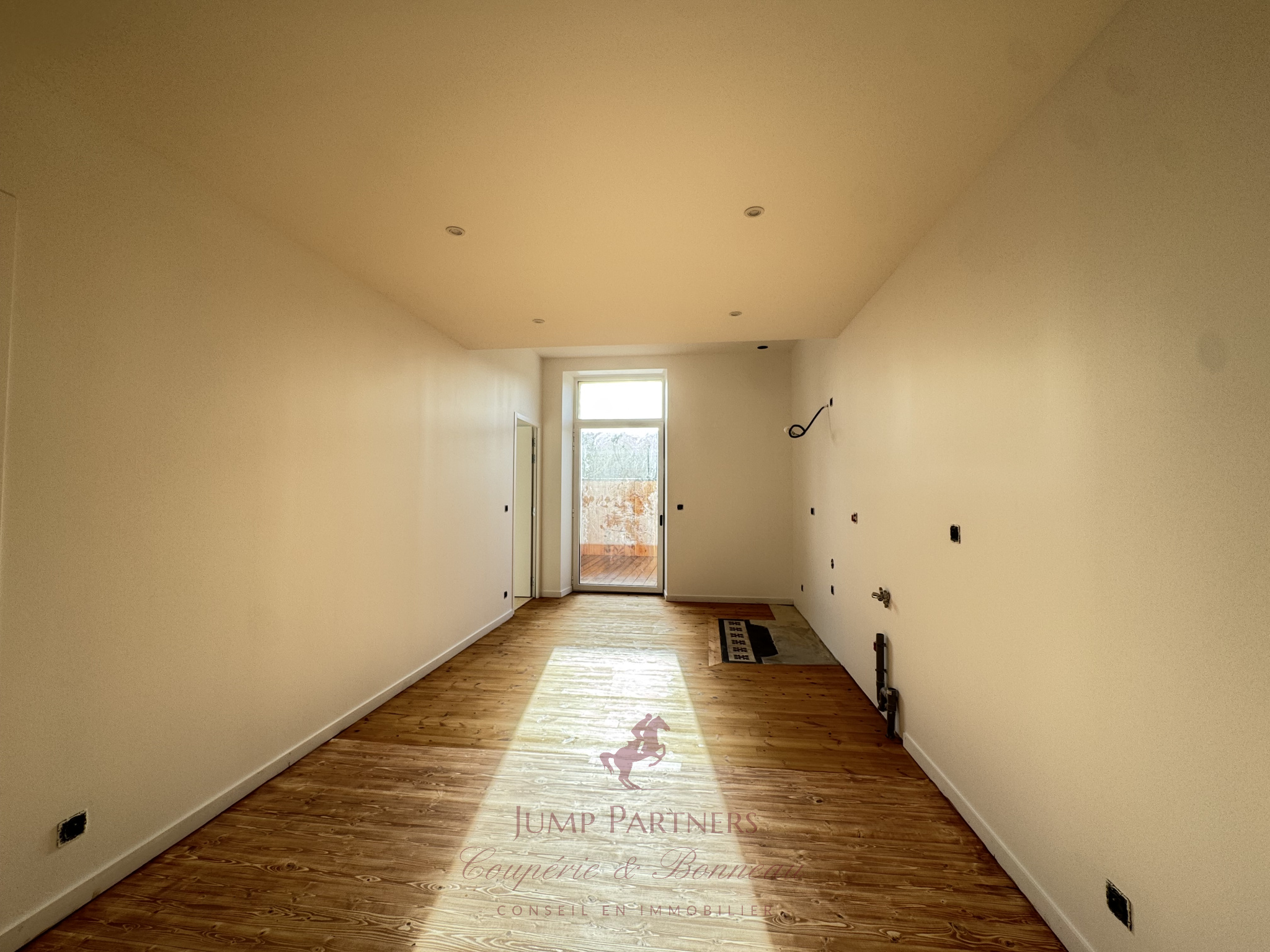 Grand séjour traversant Est/Ouest, cuisine américaine et une terrasse exposée sans vis-à-vis.