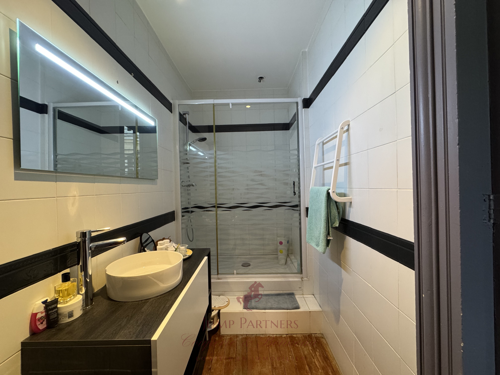 Situé au troisième étage, il séduit par ses volumes généreux et son caractère unique, sublimé par une hauteur sous plafond impressionnante, des parquets d’époque, des moulures raffinées et des cheminées élégantes.