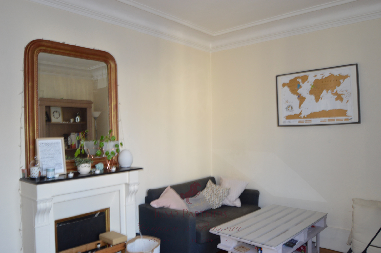 Charme de l'ancien: parquet, moulures et cheminées.